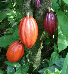 Cocoa (theobrama cacao) is a product extracted from the bean of the cacao plant (a tree originally from tropical America). Cocoa is the basic ingredient in chocolate. The different species of cacao are generally divided into two groups: cacao plants that produce superior-quality cocoa and cacao plants that produce ordinary-quality cocoa (used mostly in the industry). The fruit of the cacao plant, its pod, is an oblong berry measuring up to 12 inches long and 3 to 5 inches wide. It contains a gelatinous pulp that harbors 30 to 40 pink or pale purple seeds (beans). These seeds are made up of a kernel, a seed coat and a germ. Only the kernels are eaten, and only after being processed, as they are very bitter.