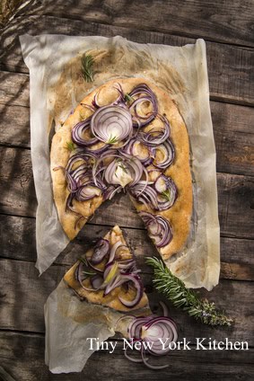 I just couldn’t live in a world without onions. I keep all sorts of onions on hand and each variety has its own personality. To me, Onion Focaccia is the ultimate comfort food. Make sure to have extra flour and water set aside in order to add them to the dough when necessary to get the right consistency, which is a smooth and elastic dough and easy to clean off your hands and working counter.