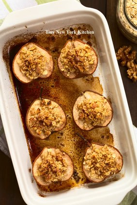 - Arrange pears cut side up in baking dish. Drizzle pears with 1 teaspoon olive oil and rub to coat all sides. Loosely top each pear with crumble mixture.
