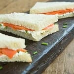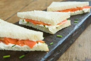 Lightly spread butter on each bread slice. Arrange salmon on buttered side of bread. Trim to fit. Top with another slice and trim crusts and cut each sandwich on the diagonal into quarters. Makes 32 Tea Sandwiches