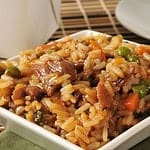 In a large-size sauté pan add 1 tablespoon canola oil over a medium-high heat. When hot add beaten eggs. Cook until just cooked through. Transfer eggs to a plate and set aside. Add remaining oil to skillet. When skillet is hot, add ginger and garlic. Cook and stir for 30 seconds. Add diced pork. Cook and stir for 5 minutes until cooked through and beginning to brown. Add cabbage, red bell pepper, green onions, peas and carrots. Cook and stir for 2 minutes until cabbage begins to wilt. Add cooked rice and eggs. Cook and stir for 4 minutes until combined and rice is warmed through. Add teriyaki sauce and soy sauce. Stir well to combine and heat through. Transfer to serving bowl and serve immediately. Serves 4