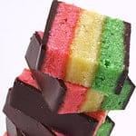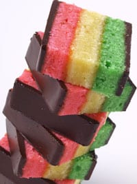Preheat the oven to 350° F. Line three 13x9x2 inch metal baking pans with foil. Leaving overhang and grease with 2 tablespoons of butter. Set aside. In a medium size bowl place the egg whites and beat with a mixer until soft peaks form. Slowly add 1/3 cup of sugar into the egg whites continuing to beat until stiff peaks form. Transfer to a large bowl and cover. Place in the refrigerator to chill for 20 minutes. In a medium size bowl beat the almond paste and remaining sugar on medium low for 5 minutes. Increase the speed to medium-high and gradually add the remaining butter. Beat until fluffy. Beat in the egg yolks and then the flour & salt. Fold in the egg whites in two additions. Divide the batter evenly among 3 bowls. Mix the red food coloring into 1 bowl and the green food coloring into the second bowl. Leave the third bowl plain. Spread 1 bowl of the batter into each prepared baking pan. Smooth the tops. Bake for 10 minutes rotating the pans halfway through until just set. Remove from the oven and let the pans cool. With a pastry brush spread half of the marmalade over the green cake. Using the foil overhang lift the plain layer out of the pan. Invert onto the green layer and throw away the foil. Brush the remaining marmalade over the plain layer. Lift the red layer out of the pan and invert onto the plain layer and cover the cake with foil. Top with a 13x9x2 inch pan. Weigh down the pan with several heavy canned goods to compress the cake layers. Refrigerate overnight. To unmold remove the cans and the top pan and foil. Transfer the cake to a waxed paper lined baking sheet. Spread half of the chocolate over the cake in a thin layer. Put into the freezer for 10 minutes. Cover with waxed paper and invert the baking sheet on top and flip the cake. Uncover and glaze with the remaining chocolate. Put in the freezer, again, for 10 minutes. Remove from the freezer and trim the cake to 12×8 inches. Cut crosswise into six 2 inch wide strips. Cut each strip crosswise into 96 inch wide cookies. Store in an airtight container. Makes 96 cookies.