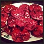 Line baking sheets with parchment paper. Whisk together flour, cocoa, baking soda, and kosher salt in medium-size bowl. Beat butter and sugar in large-size bowl for 5 minutes until fluffy. Beat in eggs, food coloring, vanilla, and vinegar. Mix flour mixture into butter mixture just to combine. Stir in white chocolate chips. Cover with plastic wrap and place in refrigerator for 2 hours. When ready to bake preheat oven to 350 degrees and remove from fridge. Let cookie dough warm up for 10 minutes before scooping. Scoop dough with ice cream scoop onto lined baking sheets. Bake cookies for 10 to 12 minutes until edges are set. Remember that every oven heats differently. You don’t want to overcook these cookies. Remove from oven and let cookies cook on baking sheets for 5 minutes. Remove from baking sheets and transfer to cooling racks. Makes about 3 dozen cookies.