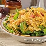 Chop the spinach and romaine lettuce and place in a large bowl. Chop the tomato, red & yellow bell pepper, cucumber, radishes and zucchini. Add to the spinach and romaine. Add the corn. Toss the salad. Arrange tortilla chips around the edges of the bowl and crumble a few on top. Serve immediately as the tortilla chips tend to get a big soggy if left to sit long. Serves 4