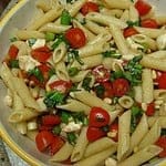 A simple pasta dish that offers a winning summertime combination of tomatoes, corn, basil and fresh mozzarella. It is great for any backyard food affair because it goes with just about everything. Dress this salad just before serving as the pasta absorbs the dressing and you may need additional lemon juice or oil.