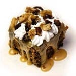 Serve the pudding warm. Reheat if necessary. Top with whipped cream and chopped walnuts. You can make this a day or two ahead of time if you wish. Serves 8