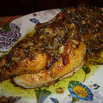 Preheat your oven to 450° F. Move your oven rack to the middle of the oven. Split the chicken in half by using kitchen shears. Open the chicken halves like a book. Wash and dry the chicken halves with paper towels. Season with kosher salt and freshly ground pepper. In a large sauté pan sear the chicken halves, skin side down, in 2 Tablespoons of olive oil, over a medium high heat for 5 minutes. Turn over and sear the other side for 2 minutes. You will want the chicken halves to be golden but not cooked through. Transfer the chicken halves to a baking pan skin side up. Roast the chicken, uncovered and skin side up, for 25 minutes. While the chicken is roasting you should make the pan sauce. For the sauce, sauté the garlic and shallots, in the same pan that you seared the chicken in, for 30 seconds. Add the chicken broth to the skillet and simmer for 5 minutes. Add the lemon juice. Add the butter into the sauce and cook for two minutes over a medium low heat. Add the parsley, thyme, oregano, kosher salt and pepper. Remove the chicken from the oven and transfer to a serving platter. Let sit for 5 minutes and spoon the pan sauce over the chicken. Serve immediately. Serves 2
