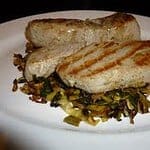 You will need two pans for making this dish. You will need a large sauté pan and a grill pan. In a large sauté pan add half of the olive oil and turn the heat to medium. Heat the oil for a minute and then add the chopped garlic, shallots and leeks. Cook and stir for 2 minutes. Add the washed spinach and sauté for 4 to 5 minutes over a medium heat. Stir constantly. Add the malt vinegar and continues to cook and stir for another minute. The spinach will shrink up significantly. Remove from the pan and transfer to a serving platter. Place the grill pan over a medium high heat and add the remaining olive oil. Place the washed and dried tuna steaks on the heated grill pan and cook on each side for 4 to 5 minutes per side. A bit less or more depending on how rare you like your tuna. Remove from the grill pan and transfer to the serving plate with the spinach. Place on top of the bed of spinach and serve. Finish with salt and pepper. Serve warm. Serves 2