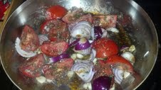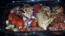 Preheat your oven to 400° F. In a large size bowl combine the tomatoes, 1 tablespoon kosher salt, 1 tablespoon freshly ground pepper, 3 tablespoons olive oil and the herbes de Provence. Toss to coat. In a large skillet heat 2 tablespoons olive oil over a medium heat. Add the quartered tomatoes, chopped onions and garlic. Heat for only 1 minute and stir constantly. Remove from the heat and place back in the large size bowl. Set aside. In the same large skillet heat another 2 tablespoons olive oil. With the remaining salt and pepper season the chicken breasts on both sides. Transfer the chicken breast to the skillet over a medium-high heat. Brown the chicken breasts for 6 minutes per side. You want the chicken breasts to be golden brown. Do NOT throw away the bits in the skillet. Pour the remaining olive oil into a glass roasting pan. Place the chicken breasts into the roasting pan. Arrange the tomato mixture around the chicken breasts. The last thing to do is to make the pan sauce. In the large skillet turn the heat to medium. Deglaze the pan with the sherry vinegar and white wine. Scrape up the browned bits from the bottom of the pan. Add the Worcestershire sauce and keep stirring for 1 minute. Turn off the heat and pour over the chicken breasts and tomatoes. Place in the oven for 30 minutes. Remove from the oven and transfer to a serving plate. Serves 2
