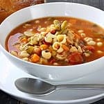 There is no set recipe for minestrone soup, since it is usually made out of whatever vegetables are in season or what you may have on hand. I had leftover pancetta from the holidays so used it in this minestrone soup. If you want to make yours meat-free then leave it out and use vegetable broth instead of chicken broth.
