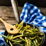This dish uses the technique of frying in hot oil until they the beans become crunchy and flavorful. You could add pork or crumbled feta cheese if you want to. I have been known to eat the cold from the fridge the next day.