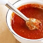 Whisk together all of the ingredients except for the salt and water in a medium size bowl. Whisk in ¼ cup of the water and ¼ cup of the salt. If you need more water to thin out the sauce then use a little more, but be careful not to thin out the sauce too much. You also don’t want the sauce to be too pasty. The sauce should easily spread over the dough. Makes 3 Cup