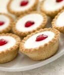 For the icing: Sift the confectioner’s sugar into a bowl. Combine with 2 tablespoons of water until smooth. Spoon the icing over the cooled tartlets and tope with candied cherry half. Makes 24 tartlets