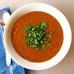 Preheat oven to 400° F. Toss together the tomatoes, ¼ cup olive oil, salt and pepper. Spread the tomatoes in 1 layer on a baking sheet and roast for 45 minutes. In an 8 quart stockpot over medium heat, sauté the onions and garlic with 2 tablespoons of olive oil, butter and red pepper flakes for about 10 minutes, until the onions start to brown. Add the canned tomatoes, basil, thyme and chicken stock. Add the oven roasted tomatoes, including the liquid on the baking sheet. Bring to a boil and simmer uncovered for about 40 minutes. Pass through a food mill fitted with the coarsest blade. Serve hot or cold. Serves 6