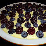 To make the filling: In a large saucepan combine the sugar and cornstarch. Gradually stir in the half & half. Cook and stir over a medium high heat until the mixture is thickened and bubbly. Reduce the heat and cook for another 2 minutes. Stir occasionally. Remove from the heat. In a medium size bowl slightly beat the egg yolks with a fork. Gradually stir 1 cup of the hot filling into the egg yolks. Add the egg yolk mixture to the saucepan. Bring to a gentle boil. Stir constantly. Reduce the heat to low and cook for another 2 minutes. Stir constantly. Remove from the heat. Stir in the butter and vanilla. Stir until the butter melts. Pour into the pie plate. Arrange the blackberries and blueberries on top. Place into the oven and bake at 325º F for 30 minutes. Remove from the oven and cool for 1 hour. Place in the refrigerator for at least 3 hours before serving. Serves 8